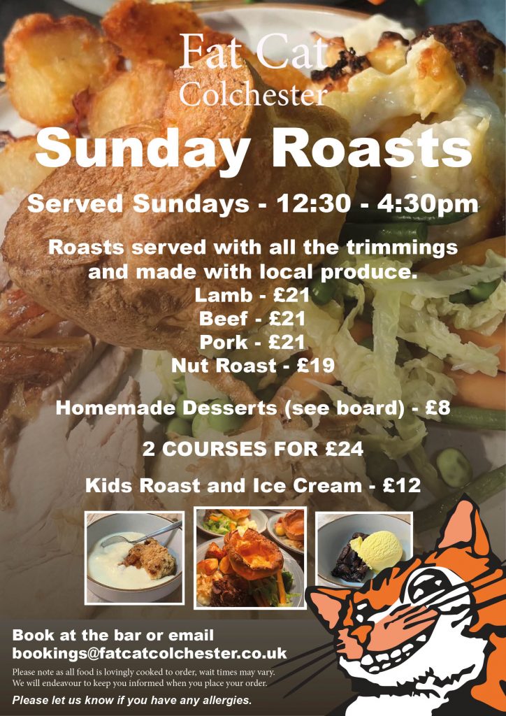 Booking advised. Served 12.30pm – 4.30pm. To book, call 01206 577990 or email bookings@fatcatcolchester.co.uk